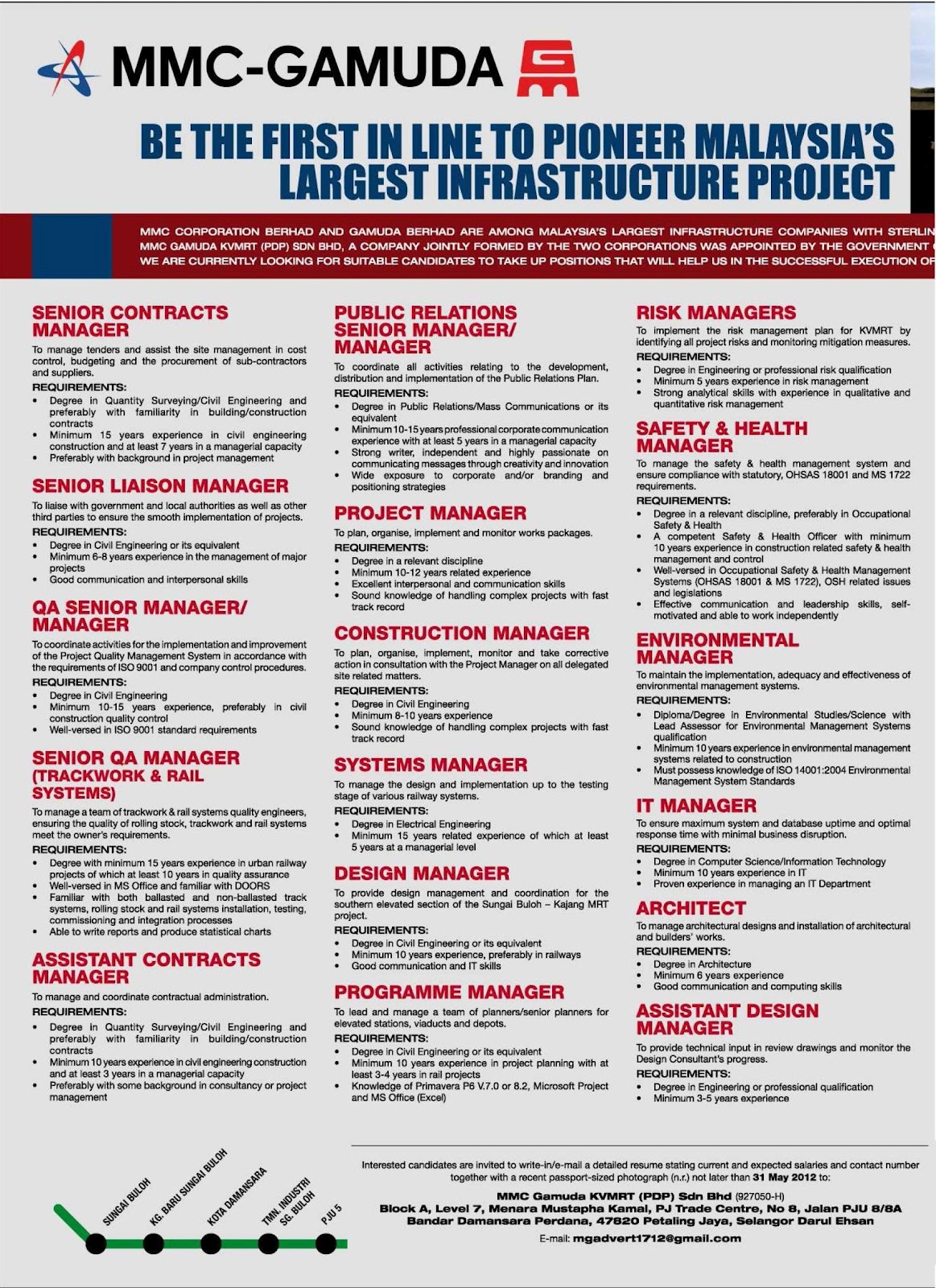 Mmc Gamuda Mrt On Twitter Job Vacancies Mmc Gamuda Kvmrt T Sdn Bhd Email Your Latest Resume To Ug Recruitment Kvmrt Ug Com My