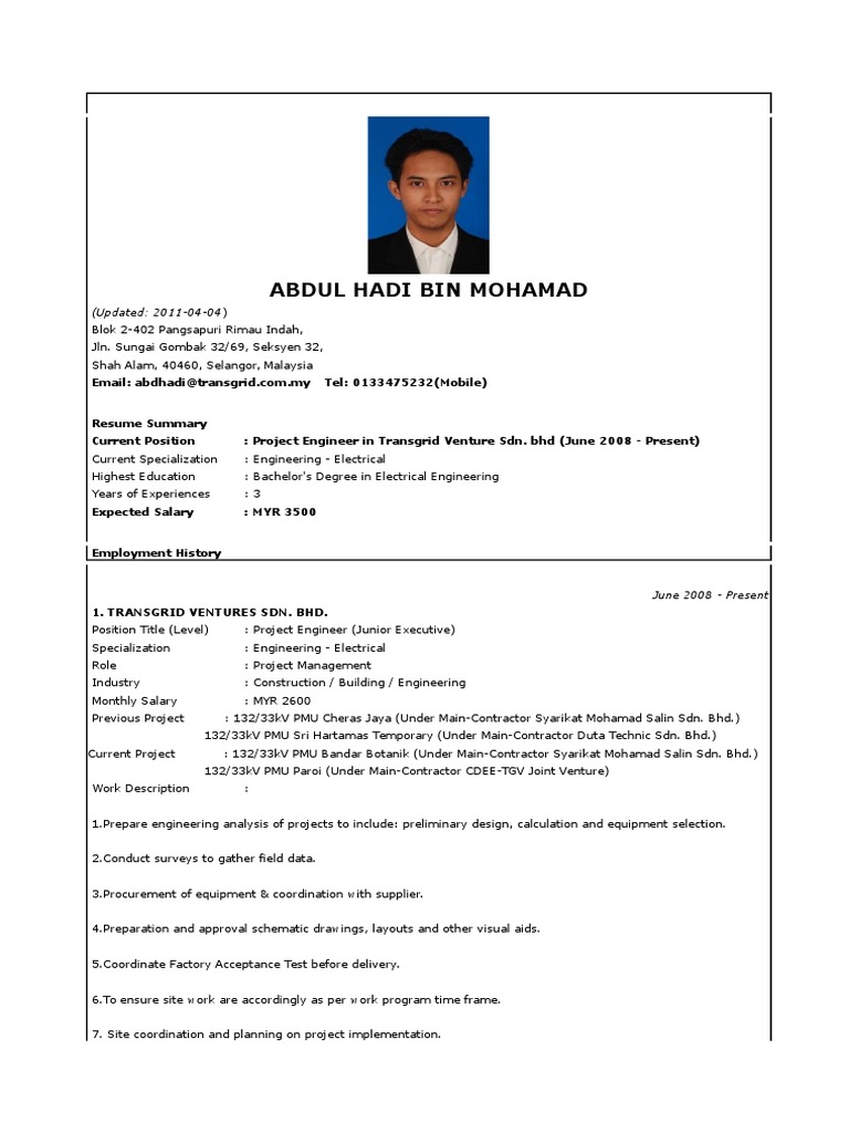 Hanif Cv 2015 Project Engineer Electrical